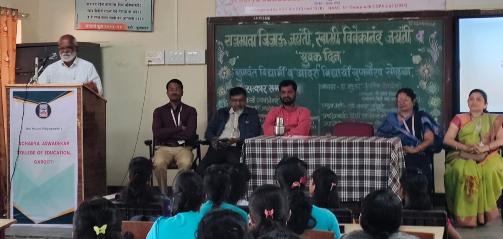 श्री.मौनी विद्यापीठ संचलित आचार्य जावडेकर शिक्षणशास्त्र महाविद्यालयात राजमाता जिजाऊ जयंती, स्वामी विवेकानंद जयंती, युवा दिन व गुणवंत विद्यार्थ्यांचा सत्कार समारंभ संयुक्तरित्या साजरा करण्यात आला. अध्यक्षस्थानी श्री.मौनी विद्यापीठाचे चेअरमन मधुआप्पा देसाई होते. तर व्याख्याते संजय खोचारे प्रमुख उपस्थित होते.