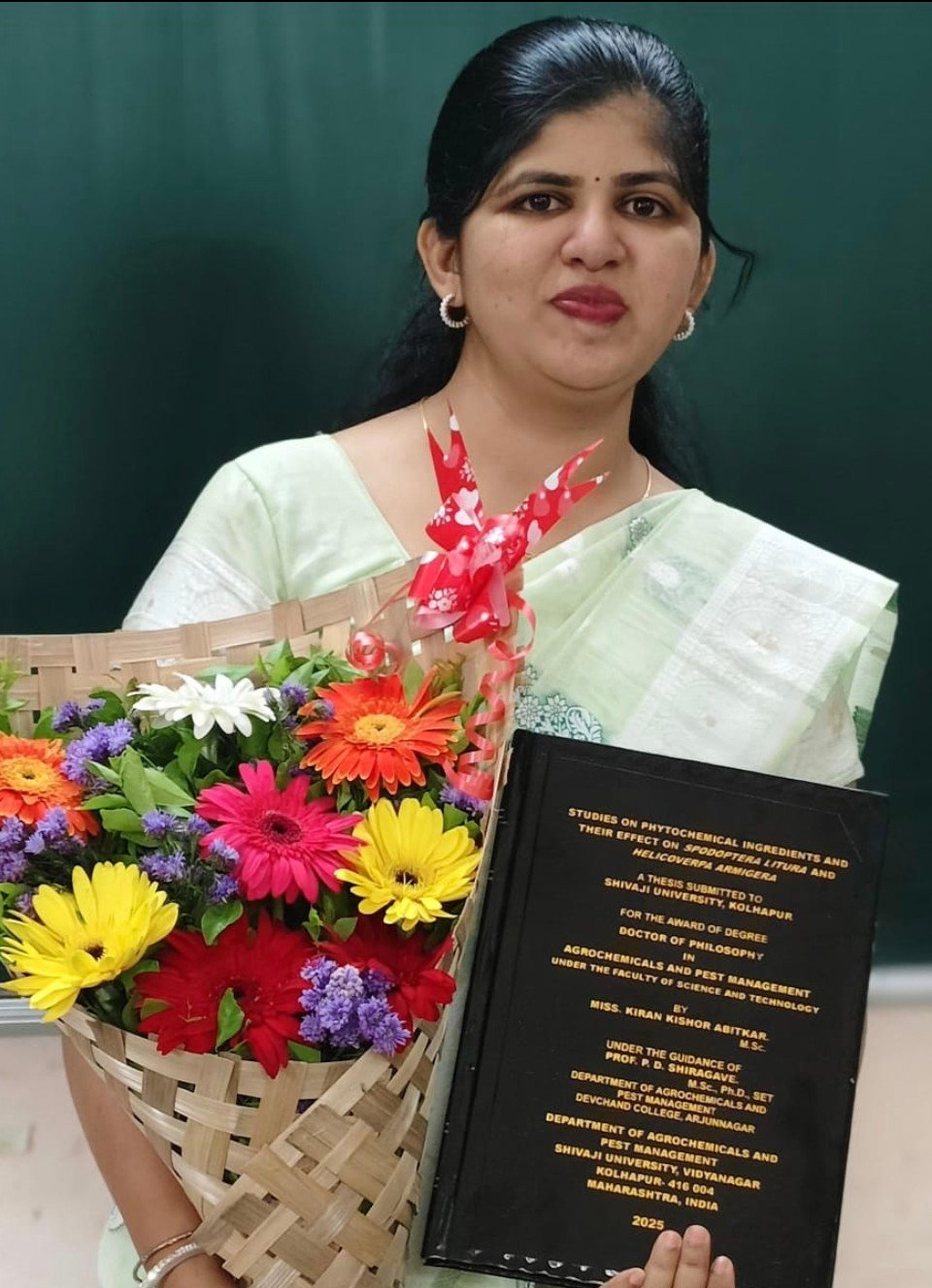 प्रा.कु.किरण रेखा किशोर आबिटकर यांच्या संशोधनाचा विषय ‘Studies on phyto chemical ingredients and their effect on Spodoptera litura and Helicoverpa armigera’ (स्टडीएस ऑन फयटोकेमिकल इंग्रेडयंट्स अँड देयर इफेक्ट ऑन स्पोडोपटेरा लिटूरा अँड हेलीकव्हरपा आर्मीजेरा) असा आहे.